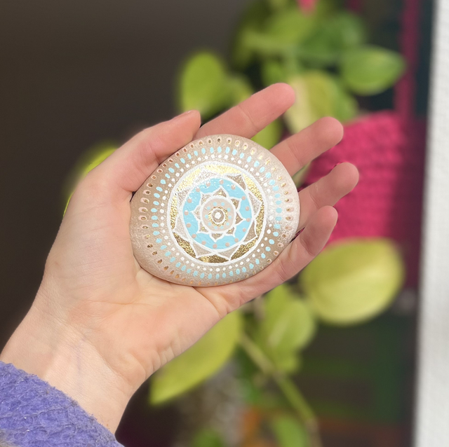Galet mandala minutieusement peint à l'acrylique et décoré de feuille d'or, aux énergies sacrées pour s'accompagner sur son chemin cyclique d'évolution..