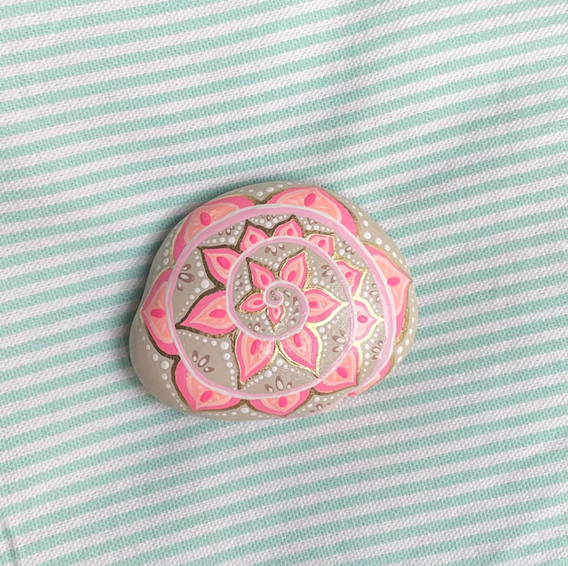 Galet mandala minutieusement peint à l'acrylique et décoré de feuille d'or, aux énergies sacrées pour s'accompagner sur son chemin cyclique d'évolution..